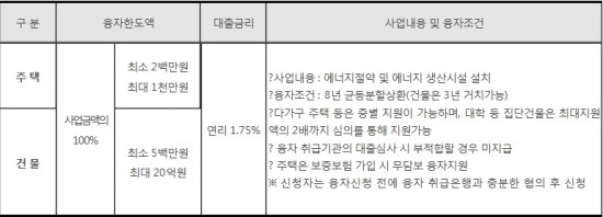 - 건물은 최소 5백만원에서 최대 20억원까지. 단, 대학 등 집단건물은 최대 지원액의 2배까지 심의를 통해 지원 가능