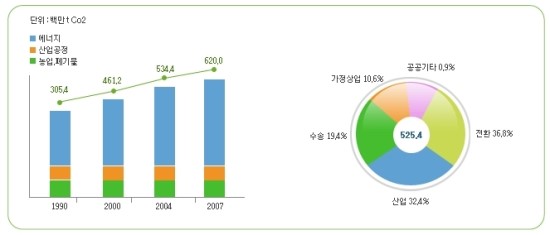 총배출량 | 305.4 (100) | 461.2 (151.0) | 534.4 (175.0) | 596.7 (195.0) | 602.6 (197.0) | 620.0 (203.0) | 4.3 |