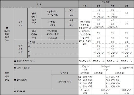 ※ 철근의 최소 피복두께는 상기(피복두께) 치수에서 10mm를 공제한 값 ※ “콘크리트구조설계기준”에 따를 경우 피복두께 항목에 대하여 4급을 인정할 수 있음. ※ 철근의 피복두께 1급에서 “건설신기술”은 철근의 방청과 관련된 기술 분야 ※ 설계기준강도는 버림, 충진 콘크리트 등 구조외적 분야에는 이 기준을 적용하지 않고 주요구조부만 적용함.