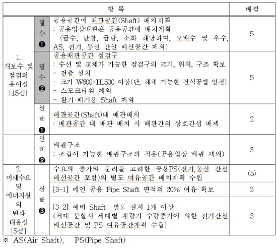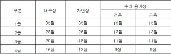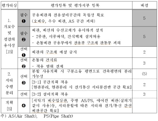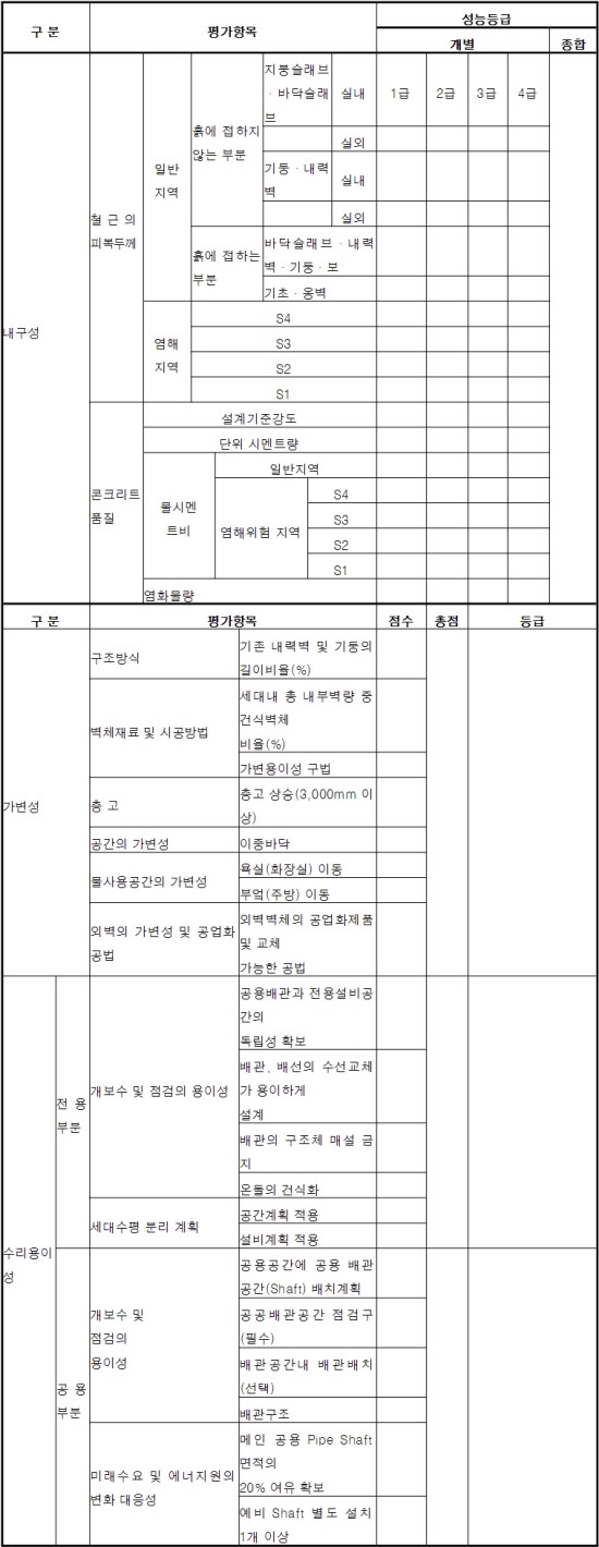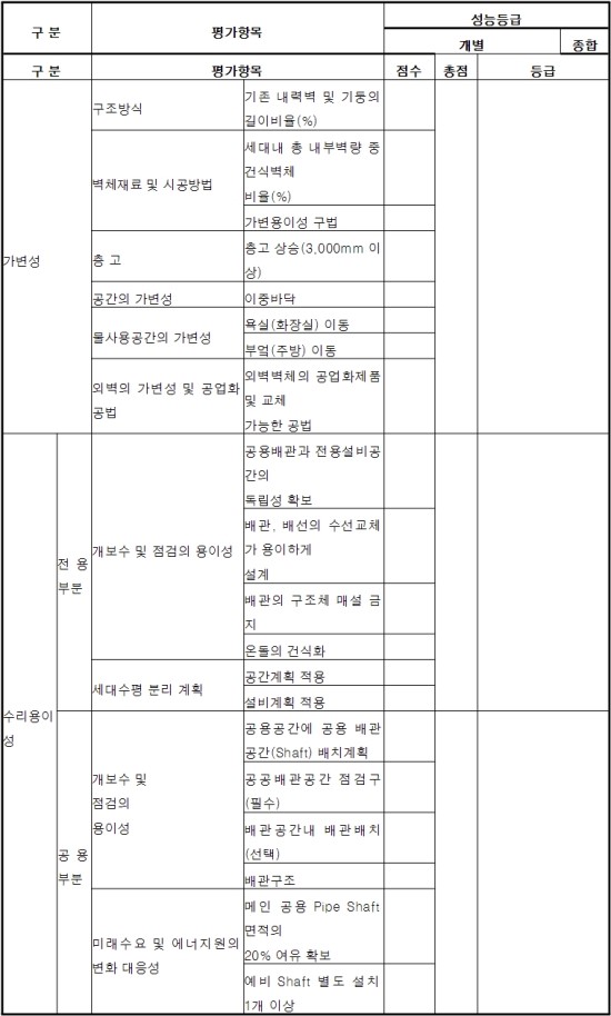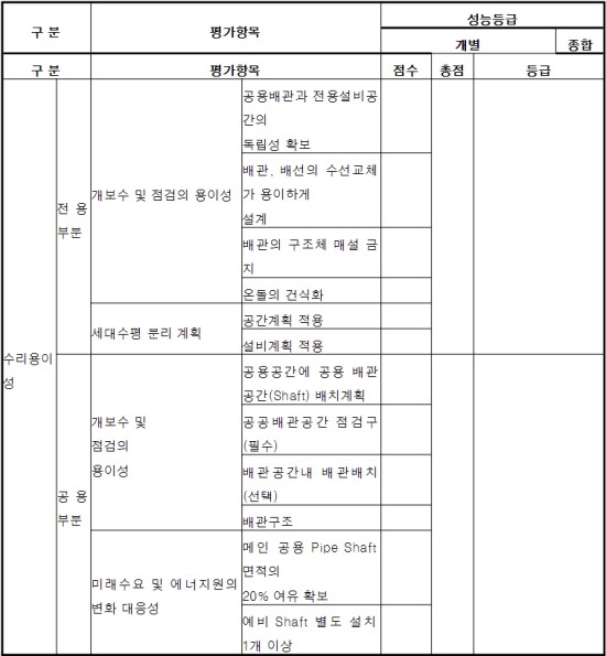 3. 수리용이성은 전용부분은 개보수 및 점검의 용이성, 세대 수평 분리계획을 평가하고, 공용부분은 개보수 및 점검의 용이성, 미래수용 및 에너지원의 변화 대응성을 평가하며, 전용부분과 공용부분을 별도로 평가하되, 필수항목을 충족한 상태에서 필수항목과 선택항목 점수의 합으로 평가한다.