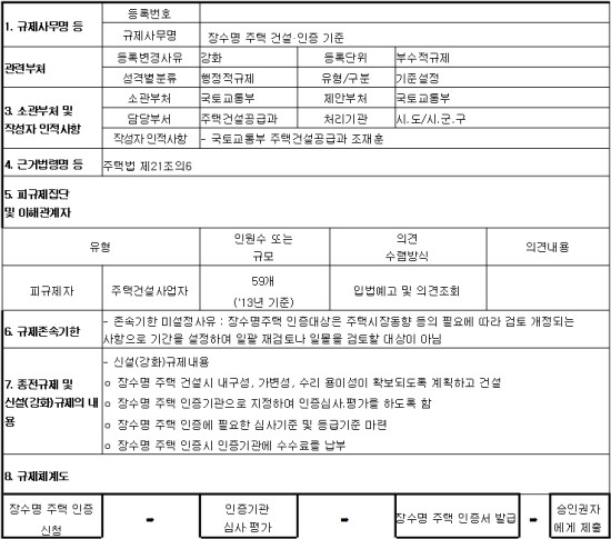 1-2. 규제의 신설․강화 필요성 정책목표 ㅇ 주택수요의 다양성, 새로운 주거생활 변화에 대응하는 등 장수명 주택 개념 정립 및 공급확대 ㅇ 가변성 및 수리 용이성을 장수명주택의 주요소로 반영하여 건설자재의 순환사용 등 사회적비용 절감 및 자원‧에너지절약 유도 □ 기대효과 ㅇ 가변성, 수리용이성 및 내구성을 주요소로 하는 “장수명주택 건설기준” 및 “장수명주택 인증제도” 를 마련‧운영하여,장래 사용자의 다양한 수요‧요구변화에 대응할 수 있는 신축공동주택의 건설기준 마련 ㅇ 공동주택의 장기적‧체계적인 관리를 유도하여 자원 및 사회적 비용 절감 규제 강화 내용 및 사유 ① 건설기준(제4조) 4조(장수명 주택 건설기준) 장수명 주택 건설기준은 다음과 같다. 1. 장수명 주택은 일반 주택에 비하여 물리적인 수명과 기능적인 수명을 높여 사회적인 변화, 기술변화, 세대변화, 가족구성 변화 및 다양성 등에 대응 할 수 있도록 계획하고 건설하여야 한다. 2. 물리적인 장수명화를 위해서는 구조체 등 서포트의 내구성능을 높이는 것을 기본으로 하며, 동시에 수명이 짧은 내장과 전용설비 등의 인필은 구조체 속에 매설하지 않고 분리할 수 있도록 한다. 3. 가변성을 향상시키기 위해서는 세대내부 공간에 내력벽 등의 가변성에 방해가 되는 구조요소가 적은 기둥을 중심으로 하는 구조방식을 채택하도록 한다. 4. 기능적인 장수명화를 위해서는 시대 변화, 거주자 변화, 가족구성 변화, 생활 주기(Life cycle)나 생활 양식(Life style) 변화에 유연하게 대응할 수 있도록 가변성을 갖추어야 할 뿐만 아니라, 설비나 내장의 노후화, 고장 등에 대비하여 점검·보수·교체 등의 유지관리가 쉽게 이루어질 수 있도록 수리용이성을 갖추어야 한다.
