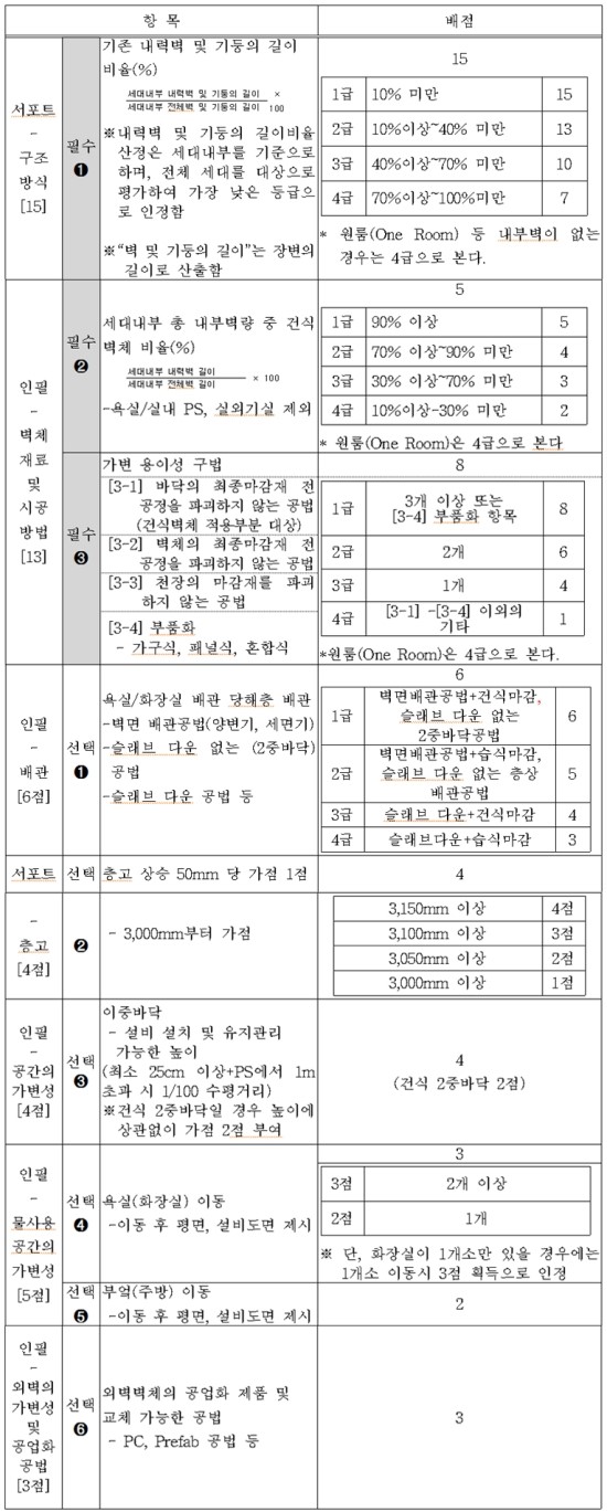 2. 가변성은 서포트와 인필 부분의 가변성 공법 등의 적용여부를 평가하며, 필수항목을 충족한 상태에서 필수항목과 선택항목 점수의 합으로 평가한다.