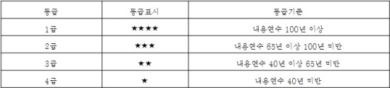 ③ 인증기준 및 등급(제6조) 다음 각 호와 같이 평가한다. 1.내구성은 철근의 피복두께와 콘크리트 품질로 평가하며 각 등급별로 정해진 성능등급기준에 따라 평가하되, 항목별로 등급이 다를 경우 가장 낮은 등급을 기준으로 전체등급을 평가한다.