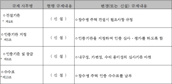 ③ 인증기준 및 등급 ④ 수수료 (2) 규제 강화의 구체적 내용 ① 건설기준(제4조) 제4조(장수명 주택 건설기준) 장수명 주택 건설기준은 다음과 같다. 1.장수명 주택은 일반 주택에 비하여 물리적인 수명과 기능적인 수명을 높여 사회적인 변화, 기술변화, 세대변화, 가족구성 변화 및 다양성 등에 대응 할 수 있도록 계획하고 건설하여야 한다.