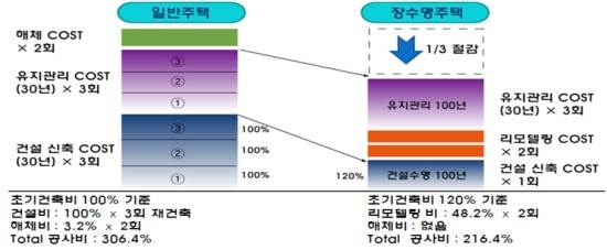 ☞ 장수명 주택은 물리적으로 오래가는 장수명(내구성), 기능적으로 사용자에 맞도록 변경하고 수리하여 쓰는 장수명(가변성, 수리 용이성) 주택을 보급하기 위한 것임